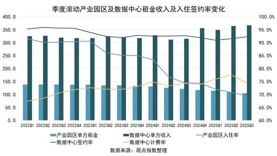 与产业园区的低迷表现形成鲜明对比,数据中心市场同期发展态势相对较好。收入端数据显示,数据中心单方收入从2022年第一季度的325.1元/㎡/月持续上升,2025年第三季度仍稳定保持在366元/㎡/月以上,增长动力持续强劲。