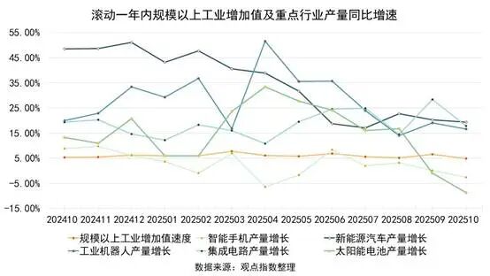 与传统制造业的调整态势形成鲜明对比,科技驱动型产业在市场竞争中展现出强劲的增长韧性。从滚动一年内重点行业产量同比增速来看,工业机器人、集成电路、新能源汽车等新兴赛道表现尤为突出,成为拉动工业经济的重要力量。
