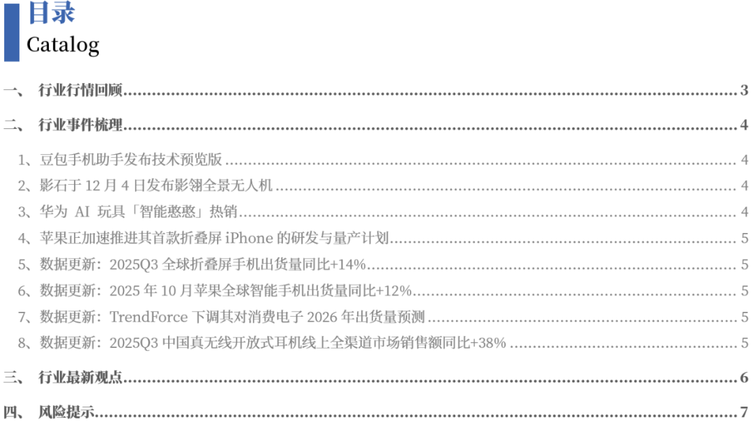行业重要事件梳理:1)12月1日,豆包手机助手发布技术预览版。12月2日晚,多位用户反馈,在nubia M153上使用豆包手机助手操作手机功能时,如果涉及操作微信,会出现微信异常退出,甚至无法登录的情况。12月5日,豆包手机助手表示计划在接下来的一段时间,在部分场景,对AI操作手机的能力做一些规范化调整。我们认为豆包与努比亚手机深度集成合作形成的“AI 手机”是AI端侧应用的一个重要进展。具体实现路径方面,豆包手机助手通过与努比亚手机在操作系统层面合作获取了系统级权限,然后借助于GUI Agent等技术实现对手机APP的操作。目前方案面临的主要问题是,AI Agent与各应用之间产生了“对抗”关系,本质上是手机厂商-AI-应用之间生态关系重构的问题。我们认为当前仍处于“AI手机”发展的初级阶段,但可以预期的是,AI Agent功能会成为接下来手机厂商迭代新机的主要发力点,“AI手机”带来的全新交互体验会刺激用户更换新机需求;AI Agent提升了硬件端功耗,围绕解决手机发热、通讯、续航等问题的相关零部件迎来机遇。2)12月4日,影石发布了全球首款全景无人机,影翎Antigravity A1。影翎A1基础套餐包括无人机+体感遥控器+飞行眼镜,价格6799元,另有探索套装、长续航探索套装定价分别为7999元、8499元。3)华为上周发布Mate80系列时推出首款AI情绪陪伴产品「智能憨憨」,定价399元,11月28日上午开售后迅速售罄,本周仍然是售罄状态。4)据RS Web Solutions 报道,苹果正加速推进其首款折叠屏 iPhone 的研发与量产计划。新机预计将在 2026 年秋季正式发布。5)根据 Counterpoint Research,2025年Q3全球折叠屏智能手机出货量同比增长14%。6)根据 Counterpoint Research,2025年10月苹果全球智能手机出货量同比增长12%,在全球智能手机实际出货量市场的份额达到24.2%,创历史单月新高。7)考虑存储涨价影响,TrendForce下调了其对于2026年全球智能手机、笔电、游戏机出货量的预期,预计2026年智能手机/笔电/游戏机出货量分别同比-2%/-2.4%/-4.4%,此前预测为分别同比+0.1%/+1.7%/-3.5%。8)根据洛图数据,2025年第三季度,真无线不入耳开放式耳机在传统主流电商平台的销售额为14.1亿元,同比增长38.4%。