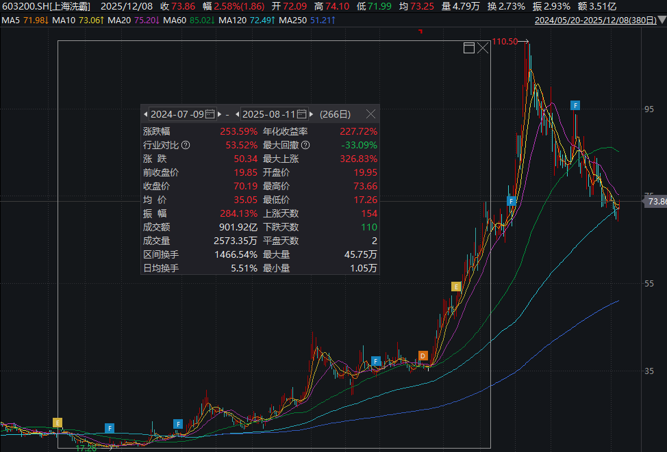 据统计,2024年7月9日至2025年8月11日,上海洗霸股价累计大涨约254%。