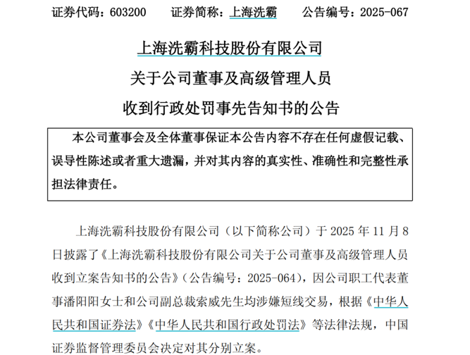 11月8日,上海洗霸发布公告称,因公司职工代表董事潘阳阳女士和公司副总裁索威先生均涉嫌短线交易,根据《中华人民共和国证券法》《中华人民共和国行政处罚法》等法律法规,中国证券监督管理委员会决定对其分别立案。