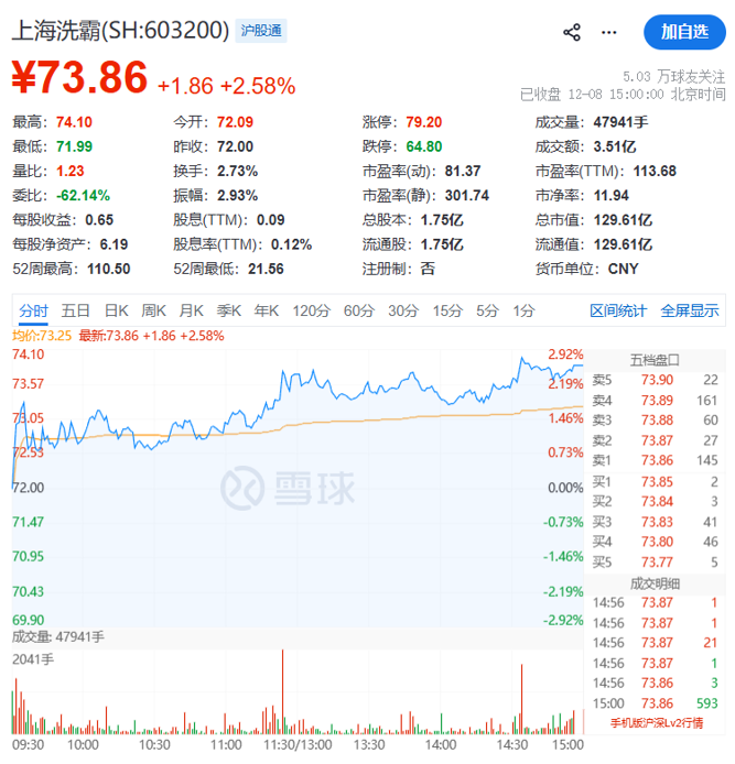 截至12月8日收盘,该股报73.86元/股,总市值为129.61亿元。