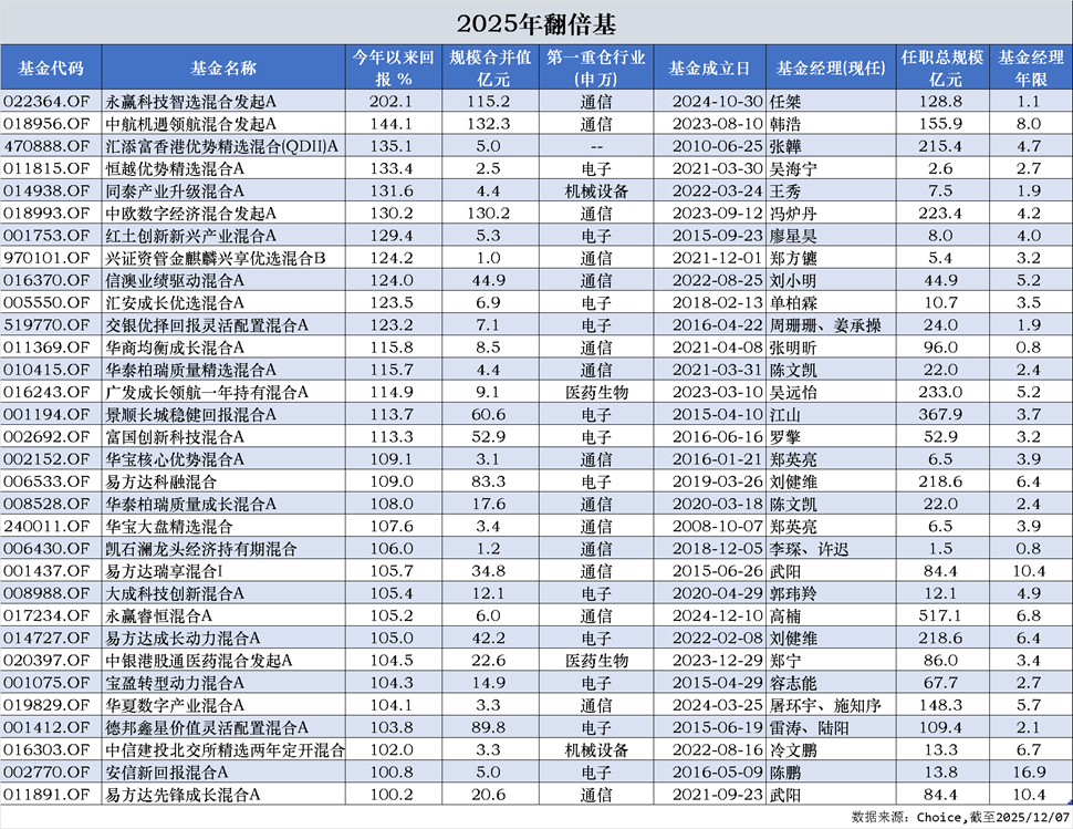 根据Choice数据,今年涨幅最大的主动权益基金无论从数量还是涨幅,都已经超越指数基金。截至12月7日,市场成功翻倍的主动权益基金已经多达32只,同时翻倍的指数基金仅2只。更让人意外的是,涨幅最大的基金已经翻了两番,涨幅与第二名拉开近60个百分点,很可能提前一个月已经锁定了今年的冠军。
