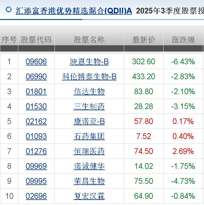 三季报显示,汇添富香港优势精选仍以港股创新药为主。