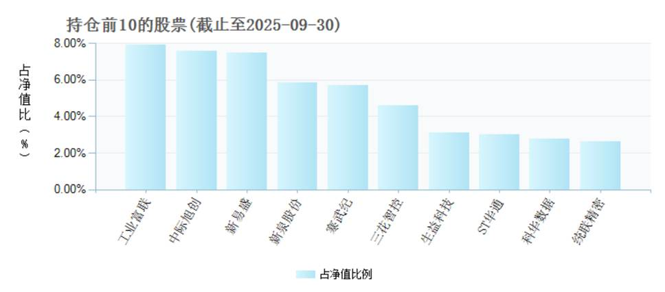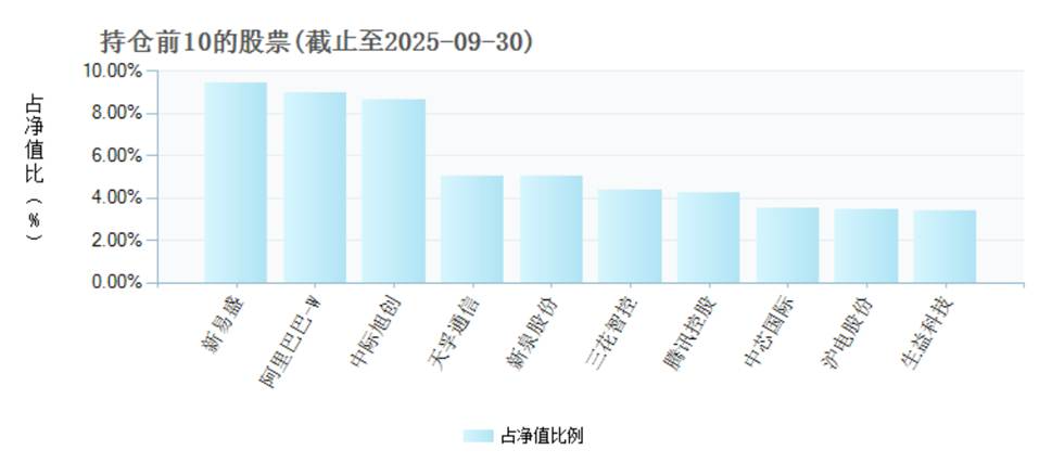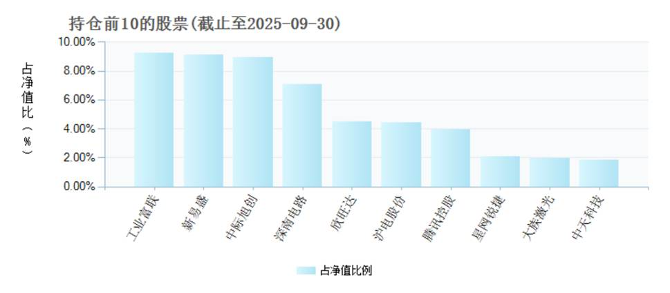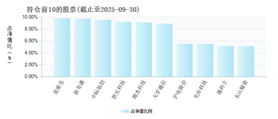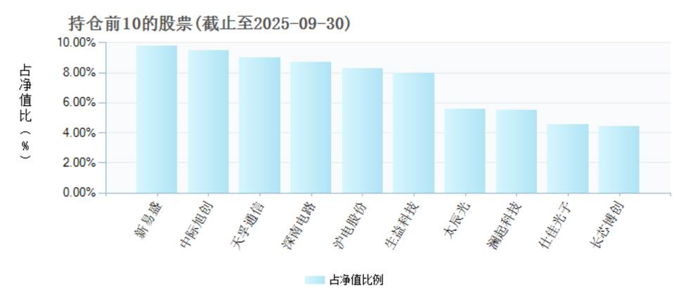 基金三季报显示,前十大重仓股包括“易中天”(新易盛、中际旭创、天孚通信)等热门科技类股票。