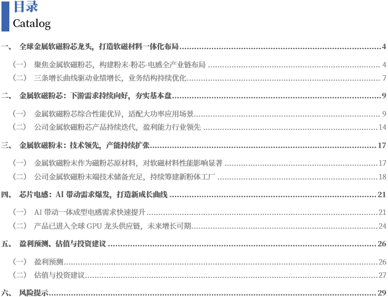 全球金属软磁粉芯龙头,打造软磁材料一体化布局。公司深耕金属软磁粉芯产业链,通过多年持续的材料技术积累和应用解决方案创新,形成金属软磁粉、金属软磁粉芯和电感元件的一体化布局,持续扩大产品在光伏储能、新能源汽车、AI算力等高景气赛道的应用空间。其中,金属软磁粉芯业务为公司主业,夯实底座,芯片电感业务近年来快速放量,成为公司第二成长极,带动公司盈利走高;2025Q1-3公司实现营收13.01亿元,同比增长6.03%,归母净利润2.94亿元,同比增长2.48%。