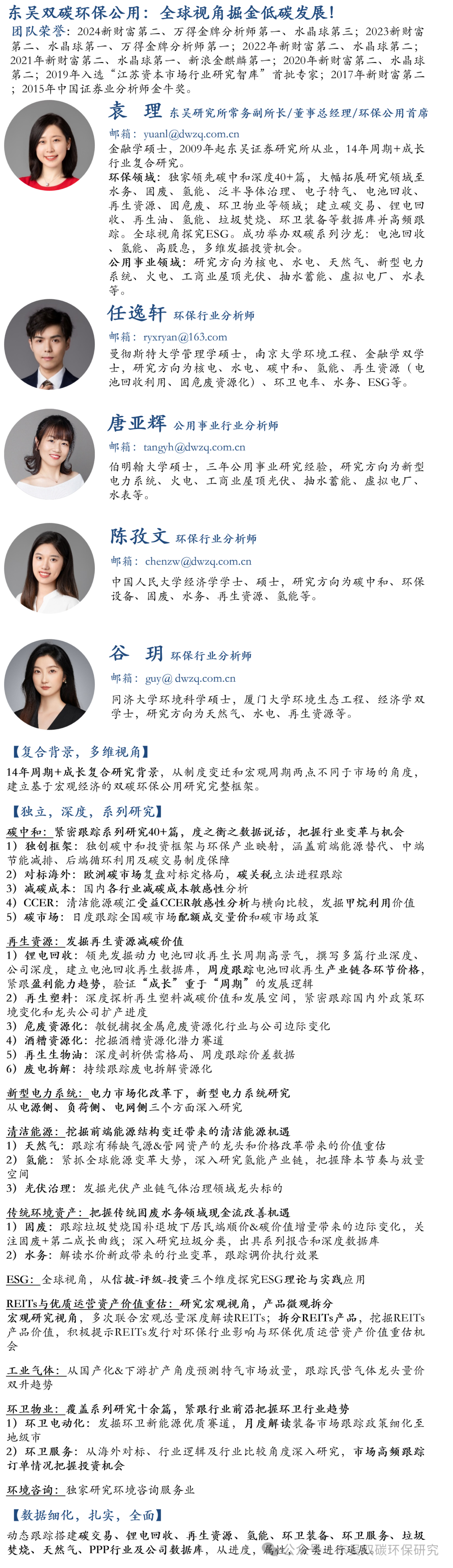 免责申明:本公众订阅号(微信号:dongwuhb)由东吴证券研究所环保团队设立,系本研究团队研究成果发布的唯一订阅号。本公众号所载的信息仅面向专业投资机构,仅供在新媒体背景下研究观点的及时交流。本订阅号不是东吴证券研究所环保团队研究报告的发布平台,所载内容均来自于东吴证券研究所已正式发布的研究报告或对已发布报告进行的跟踪与解读,如需了解详细的报告内容或研究信息,请具体参见东吴证券研究所已发布的完整报告。本订阅号所载内容不构成对具体证券在具体价位、具体时点、具体市场表现的判断或投资建议,不能够等同于指导具体投资的操作性意见。本订阅号所载内容仅供参考之用,接收人不应单纯依靠本资料的信息而取代自身的独立判断,应自主做出投资决策并自行承担风险。东吴证券研究所及本研究团队不对任何因使用本订阅号所载任何内容所引致或可能引致的损失承担任何责任。本订阅号对所载内容保留一切法律权利。订阅人对本订阅号发布的所有内容(包括文字、图片、影像等)未经书面许可,禁止复制、转载;经授权进行复制、转载的,需注明出处为“东吴证券研究所”,且不得对本订阅号所载内容进行任何有悖原意的引用、删节或修改。