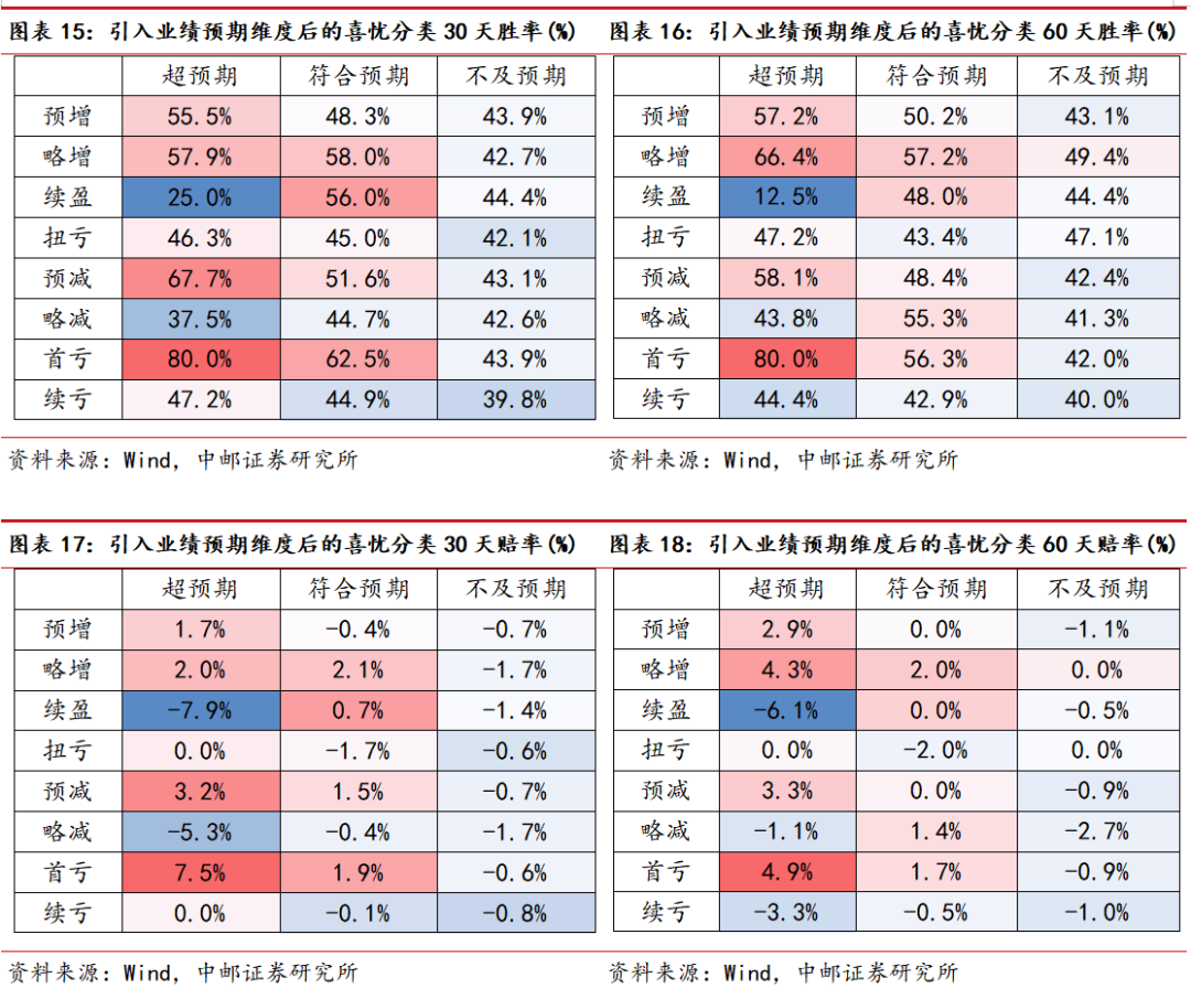 由于股票价格是对投资者对公司未来回报的折现,而公司业绩是校准投资者预期的锚,因此应当将投资者对公司业绩的预期纳入考量之中。在对公司业绩预告中的净利增速范围和万得一致预期进行比较后,可以引入业绩预告是否及预期的新维度无论是在30天还是60天时间截面上,个股超额收益率的胜率大致符合“超预期>符合预期>不及预期”。也就是说业绩是否超预期能成为一个可行的增强方向。