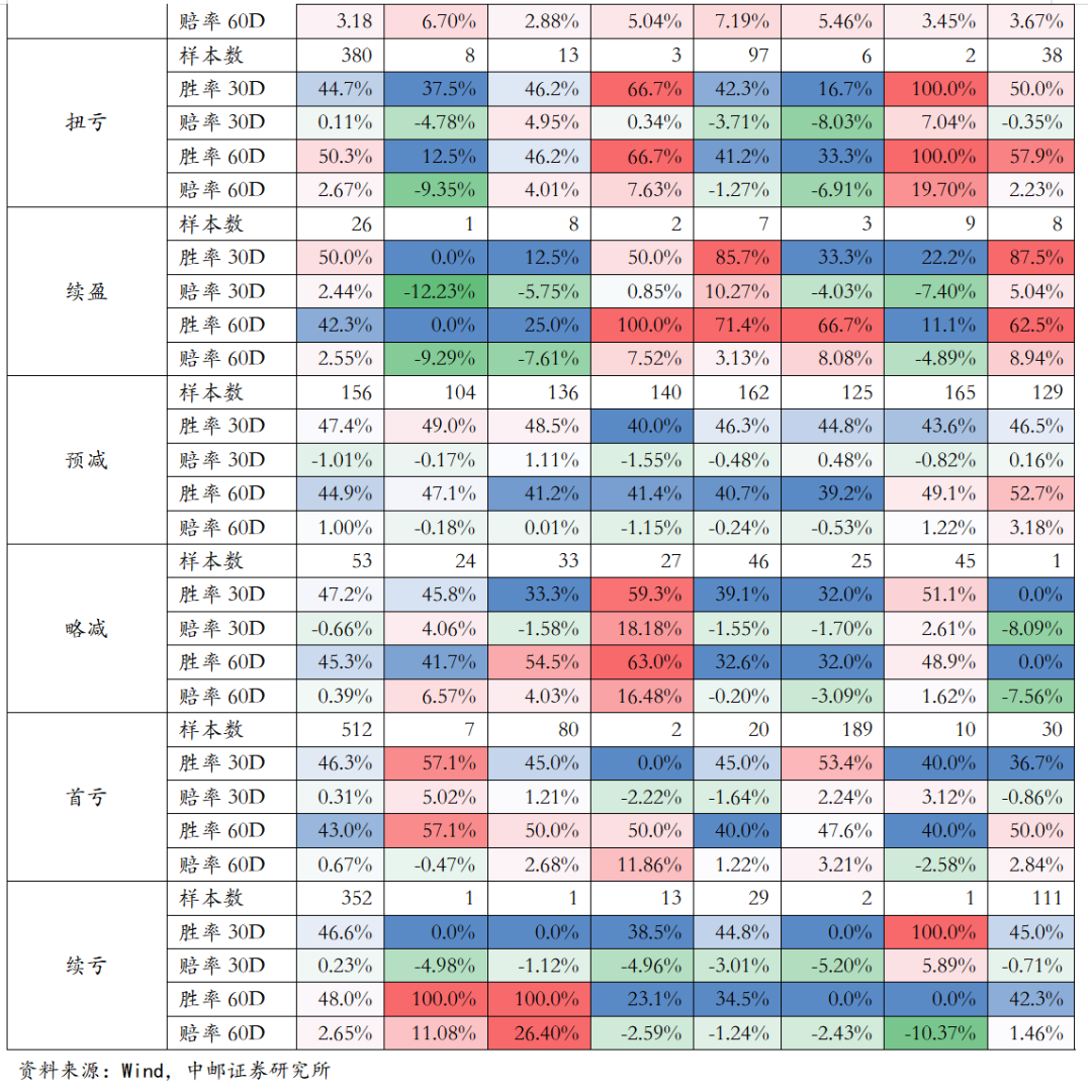 在预忧分类中,各个细项的胜率走势之间并没有明显的差异,更多取决于当年的A股整体走势。于是在以喜忧分类衡量年报的业绩预告时也就得到了一个简单策略,买入业绩扭亏的个股在2023财年这样的极端熊市年份之外都有50%以上的概率在60天能获得超额收益。而业绩预忧的个股在这个粗略的分类策略中属于是完全无法触碰的类型。