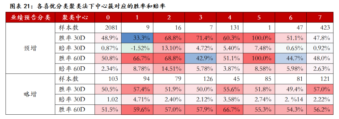 在《业绩之锚》系列的第一篇中,面对如何基于业绩预告获得超额收益这一命题,当时采用了再分类蒸馏的方法,在后续系列中改进了数理统计方法使用聚类的方法来寻找能获得稳定超额收益的区间。在本篇报告中,也采用聚类的方法来构建基于年报业绩预告的投资组合。