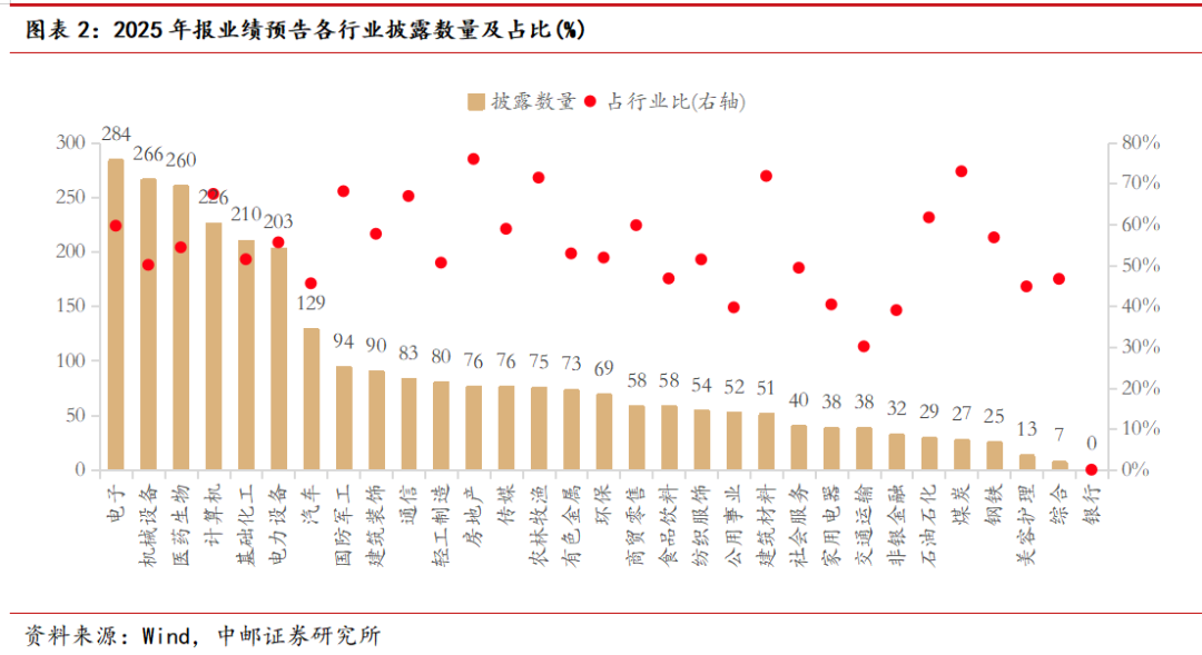 发布2025年报业绩预告的公司数量基本和过去两年持平,在公司的行业分布上以电子、机械设备、医药生物、计算机、基础化工和电力设备6大行业为主。除银行、非银金融、交通运输、公用事业和家用电器等行业外,大部分申万一级行业的业绩预告披露率都大致达到了50%,因此对于大部分行业而言,本次业绩预告对最终的年报有着较强的指引作用。