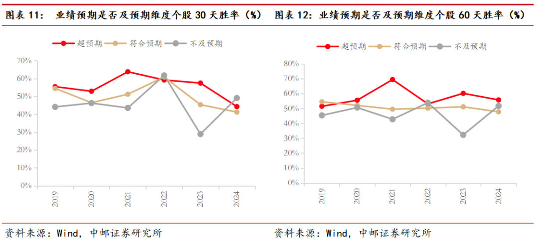 由于股票价格是对投资者对公司未来回报的折现,而公司业绩是校准投资者预期的锚,因此应当将投资者对公司业绩的预期纳入考量之中。在对公司业绩预告中的净利增速范围和万得一致预期进行比较后,可以引入业绩预告是否及预期的新维度。如图12-13所示,引入业绩预期维度后,无论是在30天还是60天时间截面上,个股获取超额收益率的胜率大致符合“超预期>符合预期>不及预期”。也就是说业绩是否超预期能成为一个可行的增强方向。