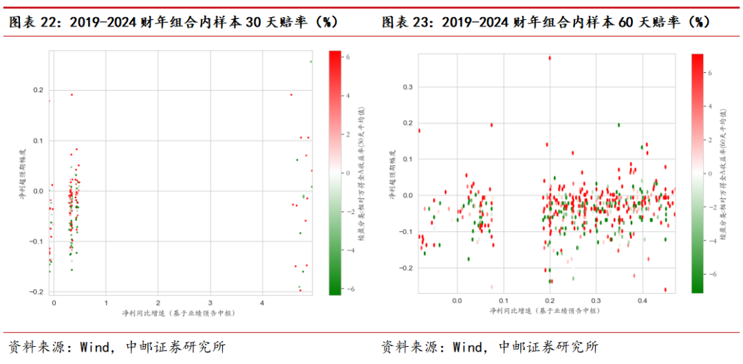 使用“业绩预告增速—业绩预告超预期幅度”的二维空间进行搜索可以发现A股对业绩预告的反应机制与偏好。基于2019-2024财年业绩预告选出的30天和60天时间截面组合所包括的样本点在“增速—超预期”二维空间上的分布。可见在30天时间截面上,市场仍会选择一些业绩预告高增的个股,要求的净利增速需要达到400%以上。而在60天的时间截面上,统计数据显示高业绩预告的净利增速无法提供超额收益,选择的簇集中于略增的分类,体现了符合预期的可持续温和增速在更长时间维度上获得超额收益的确定性。同时也需要注意某些预忧分类的簇在30天和60天时间截面上都展现出了良好的胜率和赔率,也反应了市场对于业绩下滑确实存在“利空出尽是利好”的反应机制。