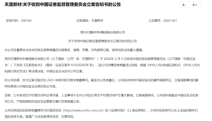 亚辉龙与天晟新材在公告中均表示,立案调查源于公司涉嫌信息披露违法违规,证监会的立案决定依据《中华人民共和国证券法》《中华人民共和国行政处罚法》等相关法律法规作出;并强调,截至公告披露日,公司各项生产经营活动均正常开展,未因立案调查事项受到重大影响;立案调查期间,将积极配合中国证监会的相关调查工作,并严格按照法律法规及监管要求,及时履行信息披露义务。