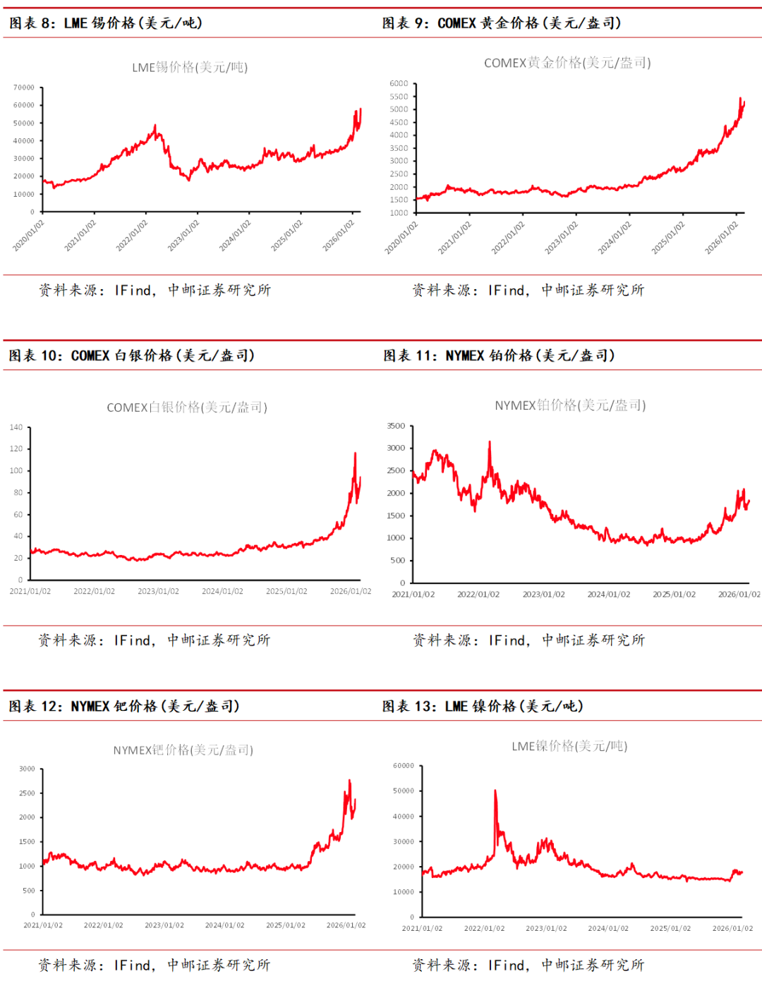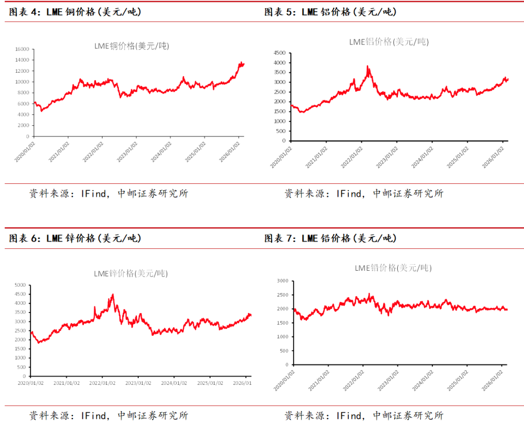 贵金属:地缘风险推高价格。本周贵金属市场聚焦于伊朗问题,目前伊核谈判进展有限,双方在核心议题,即伊朗铀浓缩问题上仍存分歧,美方不排除对伊朗进行军事行动的可能性,贵金属市场定价地缘风险而上涨,本周黄金上涨2.63%,白银上涨8.40%。长期来看,沃什的降息+缩表政策的实施,会对长端美债带来难以对冲的风险,美债走出牛陡的情况下,黄金值得增配。