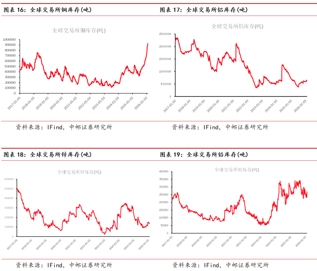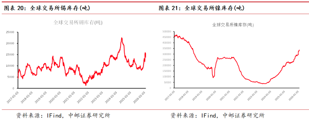 基本金属方面:本周全球显性库存铜累库24006吨、铝累库699吨、锌累库5541吨、铅去库1785吨、锡去库468吨、镍累库1855吨。