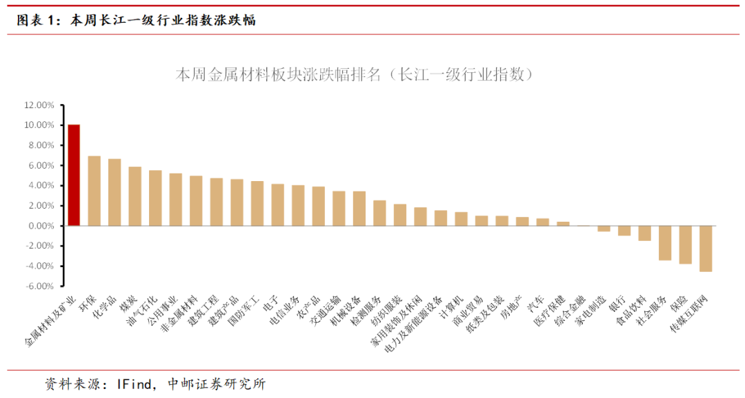根据长江一级行业划分,有色金属行业本周涨幅为10.06%,排名第1。