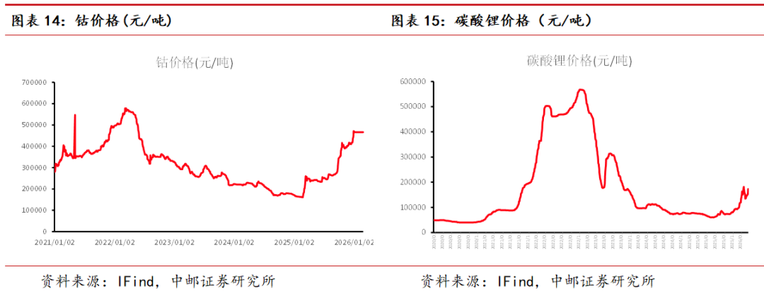 新能源金属方面:本周LME镍下跌1.23%、钴持平、碳酸锂上涨13.16%。