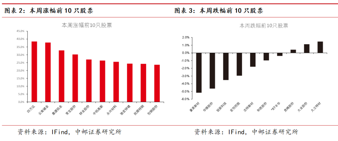 本周有色板块涨幅排名前5的是四方达、云南锗业、章源钨业、常宝股份、锌业股份;跌幅排名前5的是豪美新材(维权)、华锋股份、锐新科技、宏创控股、志特新材。