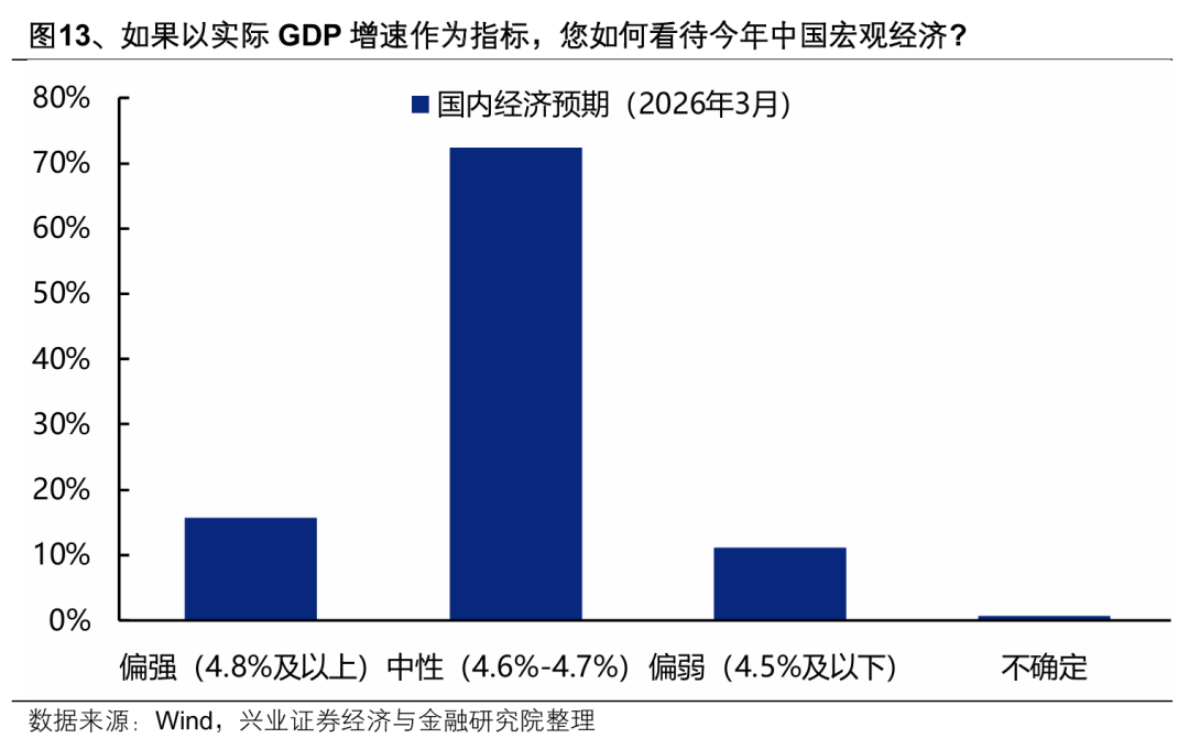 大多数机构投资者认为今年国内宏观经济增长将保持中性(4.6%-4.7%)(72%)。