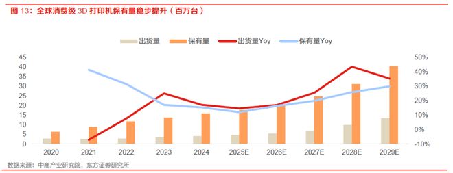 根据东方证券的测算,2025年全球消费级3D打印市场规模将达到29.59亿美元,同比激增55%。根据KBV Research,2028年,这一数字有望突破71亿美元。