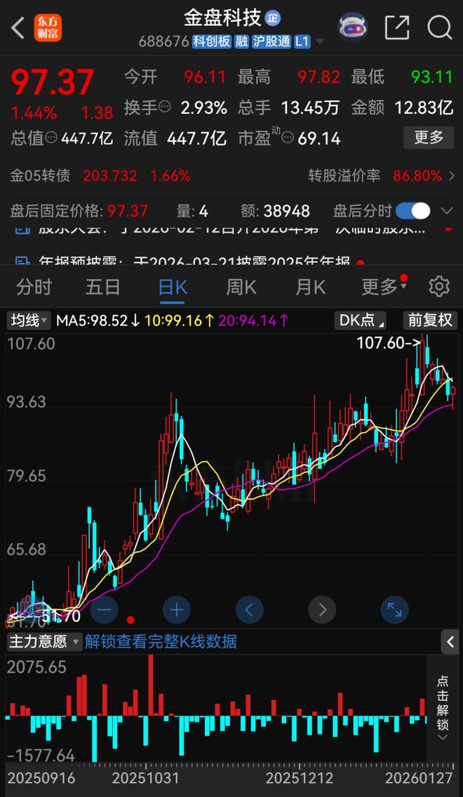 1月27日收盘,金盘科技股价报97.37元/股,总市值为447.7亿元。截至2025年9月30日,公司股东人数约为1.49万户。