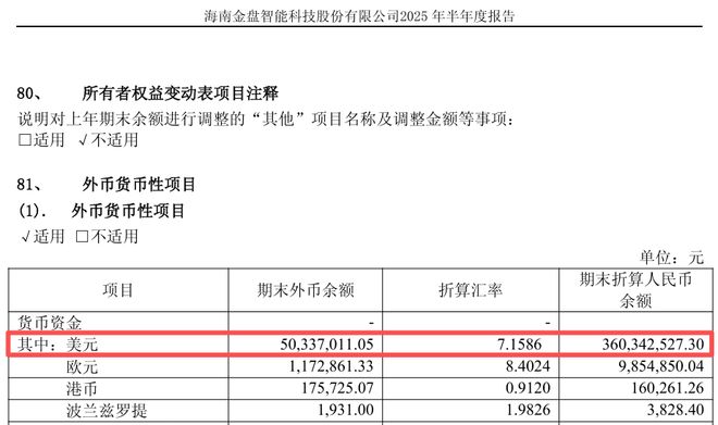 截至2025年6月30日,金盘科技的外币货币性项目中,货币资金以美元为主,达5033.70万美元,约合人民币3.60亿元。