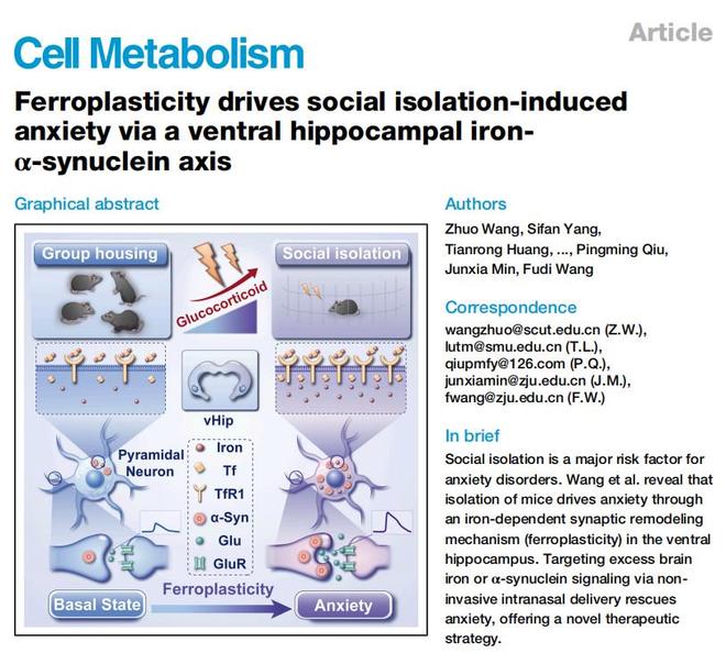 近日,华南理工大学医学院王卓副教授团队联合浙江大学、南方医科大学等单位,在国际期刊《细胞·代谢》上发表原创性研究成果。该研究首次揭示了社交隔离会触发大脑特定区域的“铁堆积”,进而激活一条全新的神经可塑性通路——研究团队将其命名为“铁可塑性”。这项发现,不仅解开了“孤独伤脑”的长久谜题,更开辟了一条无需传统抗焦虑药物无创可逆的全新干预路径。