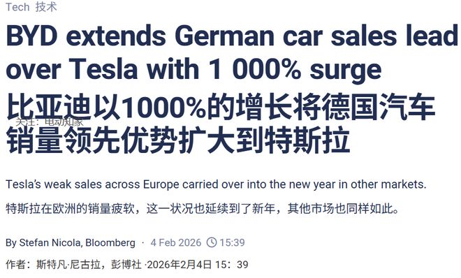 电动知家消息,2月4日,据彭博社援引德国联邦汽车运输管理局(KBA)的最新数据报道,比亚迪在德国的销量上月激增十倍以上,正式确立了其在该市场的领跑地位。