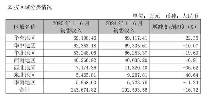 另据养元饮品2025年半年报显示,其上半年实现营业收入24.65亿,同比下降16.19%;实现归母净利润7.44亿,同比下降27.76%,首次出现营收与净利润双双下滑的局面。令人担忧的是,养元饮品在华东、华中、华北、西南、西北、东北、华南七个大区的销售收入全线下滑。