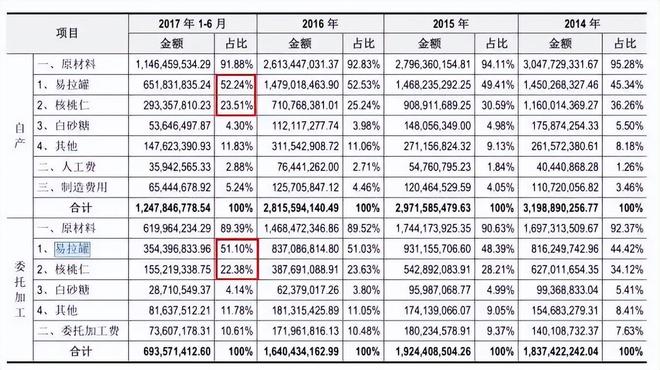 同时,六个核桃的招股书也进一步揭示了产品的成本结构:每罐成本不到一块钱,其中易拉罐占比高达52.24%,而核桃仁仅占23.51%。也就是说,一罐产品的核桃仁成本仅约0.23元,这与六个核桃高端营养饮品的市场定位极其不匹配。