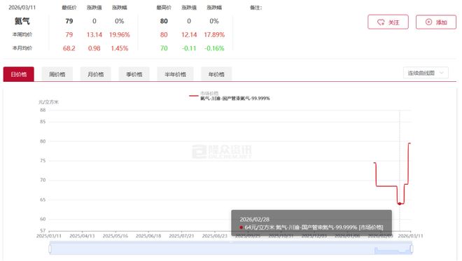 根据隆众资讯数据统计,截至3月12日,国产管束氦气市场均价已涨至79.5元/立方米,较2月28日的64元/立方米,上涨24.22%。