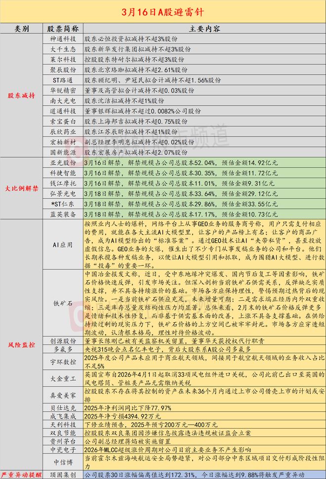 导读:财联社3月16日投资避雷针,近日A股及海外市场潜在风险事件如下。国内经济信息方面包括:1)315晚会曝光AI大模型被投毒,给AI投毒已成产业链;2)猪肉价格连降四周,全国鸡蛋降价;公司方面重点关注包括:1)创源股份董事长陈刚已被有关监察机关留置,董事华天获授权代行职责;2)央视315晚会点名亿丰电子,背后大股东系A股公司多氟多;海外市场重点关注包括:1)上周五美股三大指数集体收跌,纳指跌近1%;2)据悉美国拟宣布组建霍尔木兹海峡“护航联盟”。