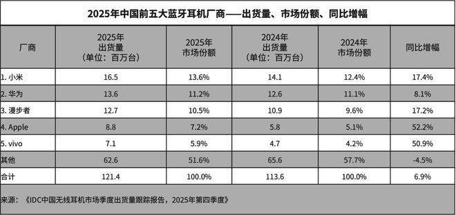 智通财经APP获悉,近年来,中国蓝牙耳机市场在经历高速增长后逐步进入结构调整阶段。国际数据公司(IDC)最新发布的报告显示,2025年,市场出货量达到12,137万台,同比增长6.9%。在整体温和增长的表象之下,产品形态、竞争主体与用户需求正同步发生深层次变化,行业正从规模扩张转向结构优化与价值重塑。