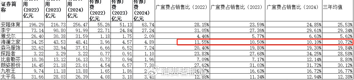 与之形成鲜明对比的是,雅戈尔与海澜之家同期销售费用合计分别为88.36亿元和126.19亿元,费用率始终维持在20%附近,显著优于行业均值。更值得注意的是,其广告支出占营收比重仅为行业平均水平的三分之一,约相当于头部运动品牌的四分之一,呈现出独特的"低投入、稳产出"运营特征。