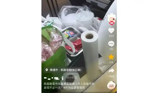 此前,有视频曝光,江苏南通启东的一家紫燕百味鸡门店,店员偷偷拿走称重后的牛肉。该消费者还称,已发现多次,终于拍到证据。