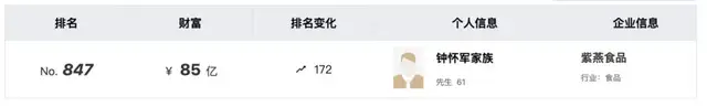紫燕食品是典型的家族化控制,钟怀军夫妇及子女,合计控制公司超7成股份。据《胡润百富榜》显示,钟氏家族身价85亿元。