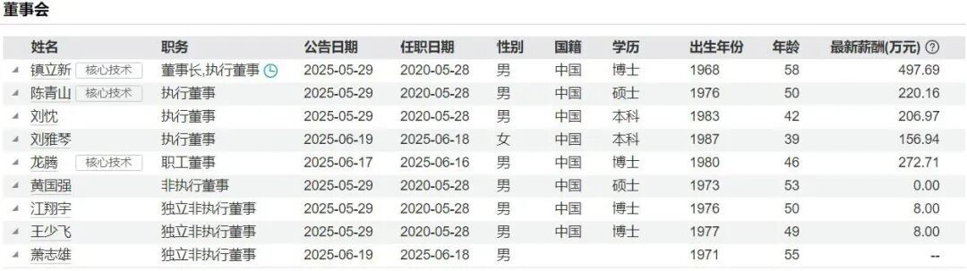 镇立新担任董事长、总经理,陈青山、龙腾,为副总经理,三人拿着高薪。2024年,镇立新年薪约498万元,大体是陈、龙二人的年薪之和。