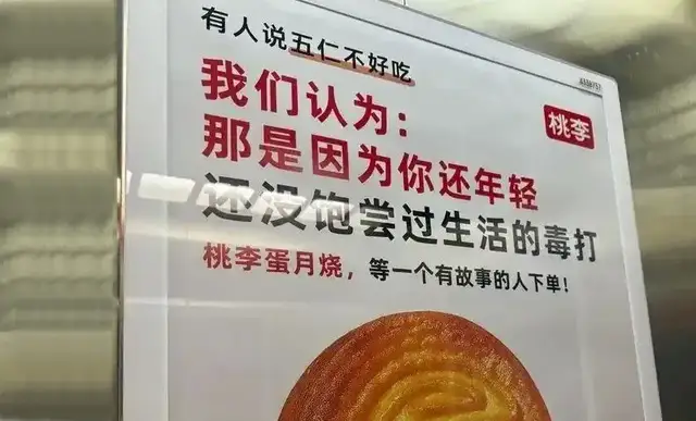 去年中秋,桃李为推广其“桃李蛋月烧”月饼,投放了一批电梯广告,“有人说五仁不好吃,我们认为:那是因为你还年轻,还没饱尝过生活的毒打。”