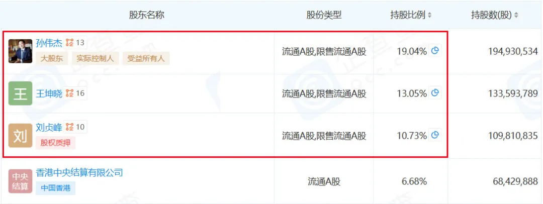 合作28年,三人仍为一致行动人,共同控制杰瑞股份,分别持有19.04%、13.05%、10.73%股权。