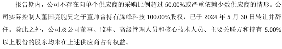 为推进IPO进程,董帅于2024年5月将腾峰科技100%股权转让,剥离了该关联关系。