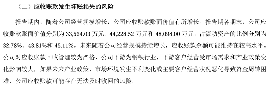 财务数据方面,2021年末至2023年末,公司资产负债率分别为57.9%、55.3%、52.1%,持续高于同行业可比公司均值;应收账款和存货账面价值占流动资产比例较高,存在一定的坏账和跌价风险。