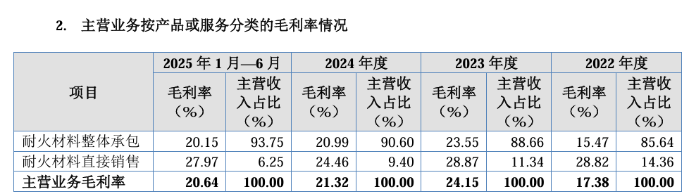 但值得注意的是,当年,公司毛利率的变动趋势也与同行存在分歧。2021年至2025年上半年,国亮新材主营业务毛利率分别为16.5%、17.4%、24.2%、21.3%、20.6%,2023年大幅增长且明显高于多数可比公司,而同期公司耐火材料整体承包业务与主要客户的结算价格呈先升后降趋势。