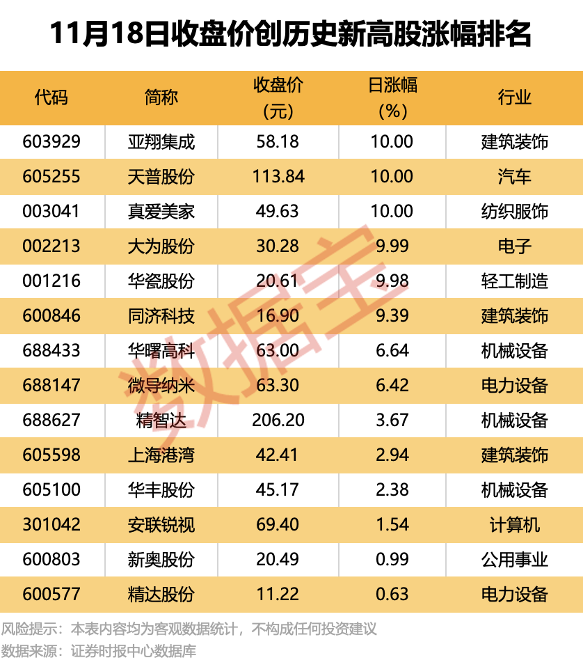 收盘价创历史新高股中,今日股价平均上涨6.04%,涨停的有真爱美家、天普股份、亚翔集成等,涨幅居前的有同济科技、华曙高科、微导纳米等。