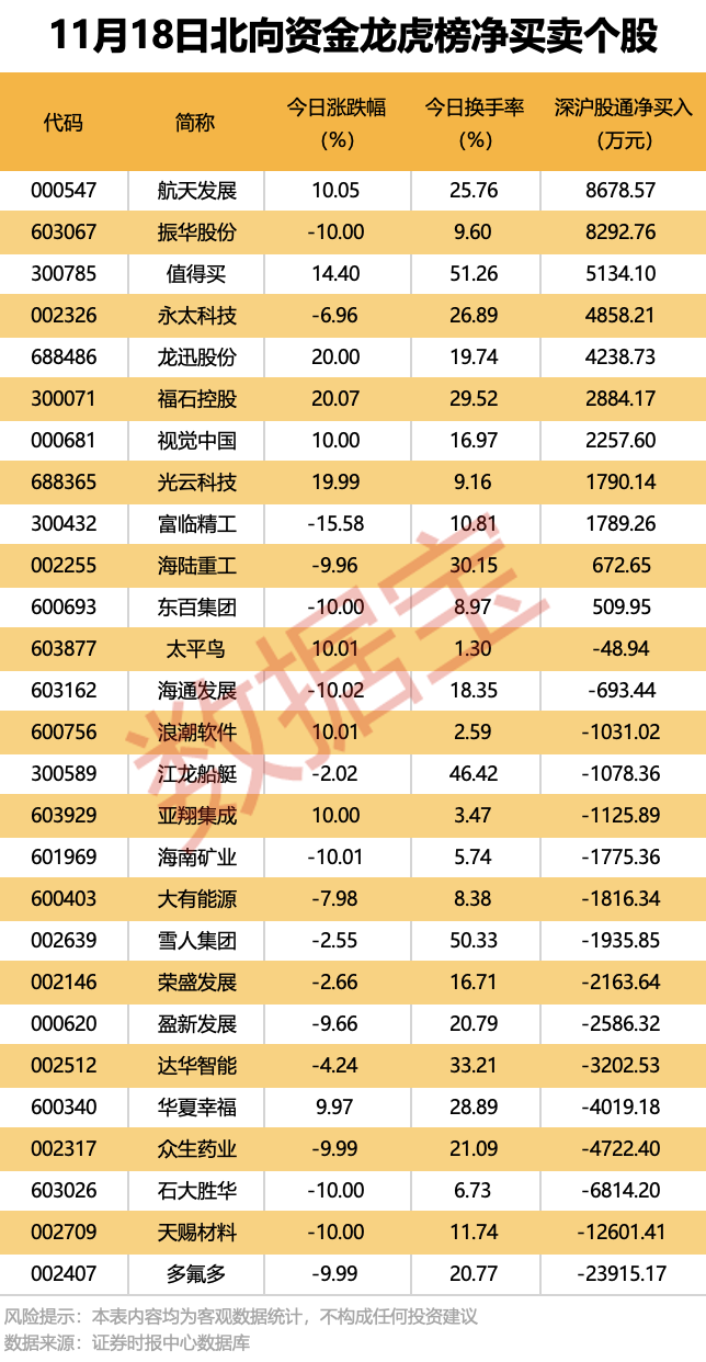 今日龙虎榜现身个股中,11股获北向资金净买入。净买入居前的是航天发展、振华股份、值得买,均超5000万元。