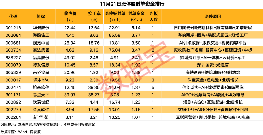 据证券时报·数据宝统计,今日(11月21日),从收盘涨停板封单量来看,海鸥住工、实达集团(维权)、华瓷股份排名前三,依次为85.58万手、75.04万手、22.91万手;深中华A、北新路桥、特发信息(维权)、欢瑞世纪封单量均在15万手以上。