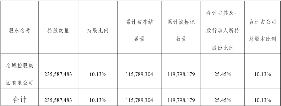 12月2日,大名城(600094)发布公告,近日,公司控股股东名城控股集团有限公司持有的公司股份中,1.16亿股被司法冻结,1.2亿股被司法标记,合计占公司总股本的10.13%。