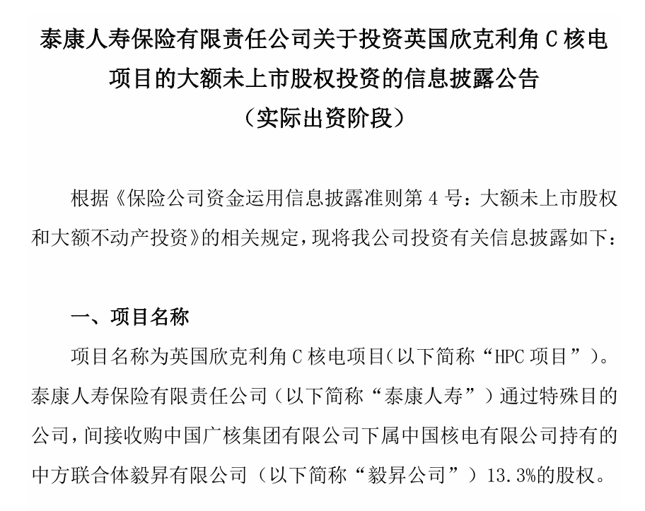 近日,泰康人寿保险有限责任公司(下称“泰康人寿”)发布大额未上市股权投资信息披露公告,披露了其参与英国欣克利角C核电项目(下称“HPC项目”)实际出资阶段的信息。