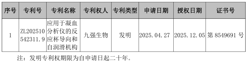 12月11日,九强生物(300406)发布公告,公司近期获得中华人民共和国国家知识产权局颁发的1项发明专利证书