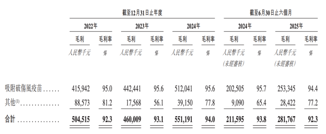 其中,破伤风疫苗长期贡献超过九成营收,根据港股招股书披露,2022至2025年上半年,该品种毛利率稳定在惊人的95%左右。
